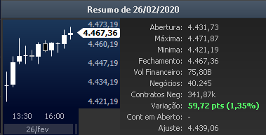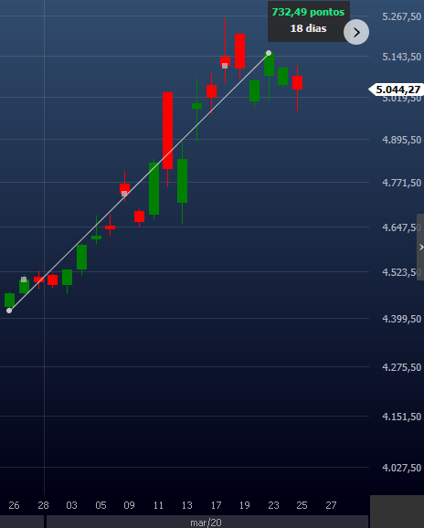 O gráfico mostrado do DOLFUT está entre a confirmação do primeiro caso de CORONAVÍRUS no Brasil(26/02/2020) e a mínima registrada no ano do IBOV(23/03/2020). Uma alta de mais de 730 pontos em 18 dias:
