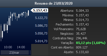 No dia 23/03/2020 o IBOV marca sua maior queda anual dos últimos anos, marcando a mínima no ano. Entretanto o DÓLAR renova sua máxima histórica até aquele momento e termina cotado a R$5,15: