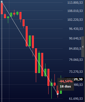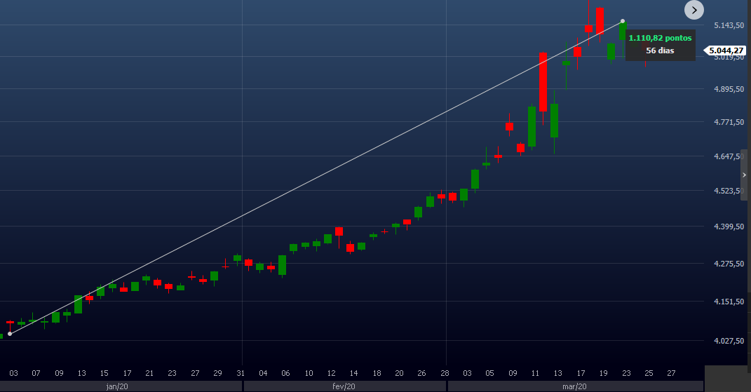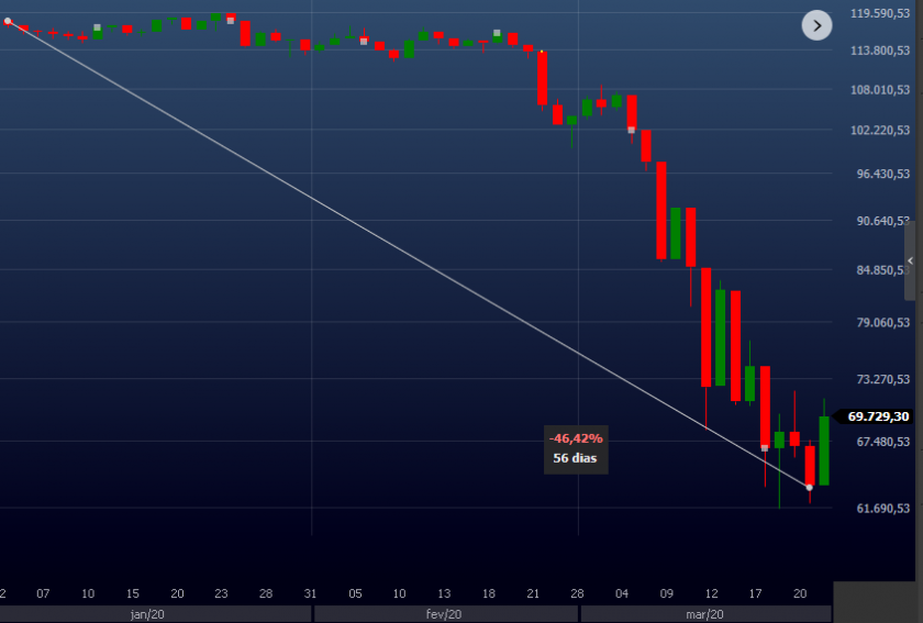 Essa imagem mostra o gráfico do IBOV no período entre o fechamento do dia 02/01/2020 e o fechamento no dia 23/03/2020 (mínima do ano). No intervalo de 56 dias o IBOV teve uma queda de 46,42%: