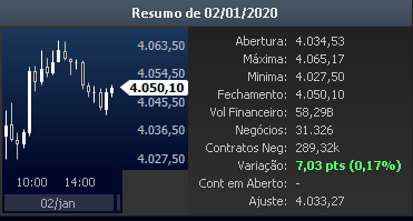 Em primeiro lugar o primeiro dia do ano de negociação do DÓLAR (02/01/2020). O DÓLAR termina cotado a R$4,05: