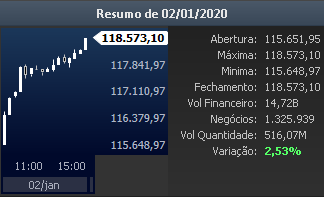 A princípio o primeiro pregão do IBOV no ano de 2020 (02/01/2020). Fechamento: 118.573,1 pontos alta de 2,53%: