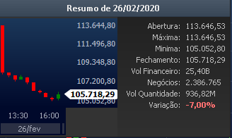 - No dia 26/02/2020 o ministério da saúde confirma o primeiro caso CORONAVÍRUS no Brasil. Instantaneamente o IBOV sofre uma reação. Uma queda de 7%. Dados do dia: