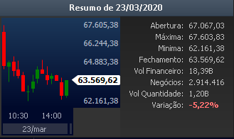 Logo depois no dia 23/03/2020 o IBOV marca sua maior queda anual dos últimos anos, marcando a mínima no ano. 63.569,62 pontos: