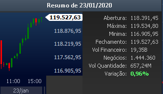 No dia 23/01/2020 o IBOV marcou sua máxima histórica. 119.527,63 pontos. Dados daquele dia:
